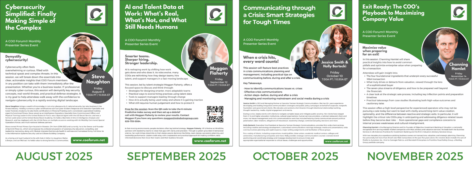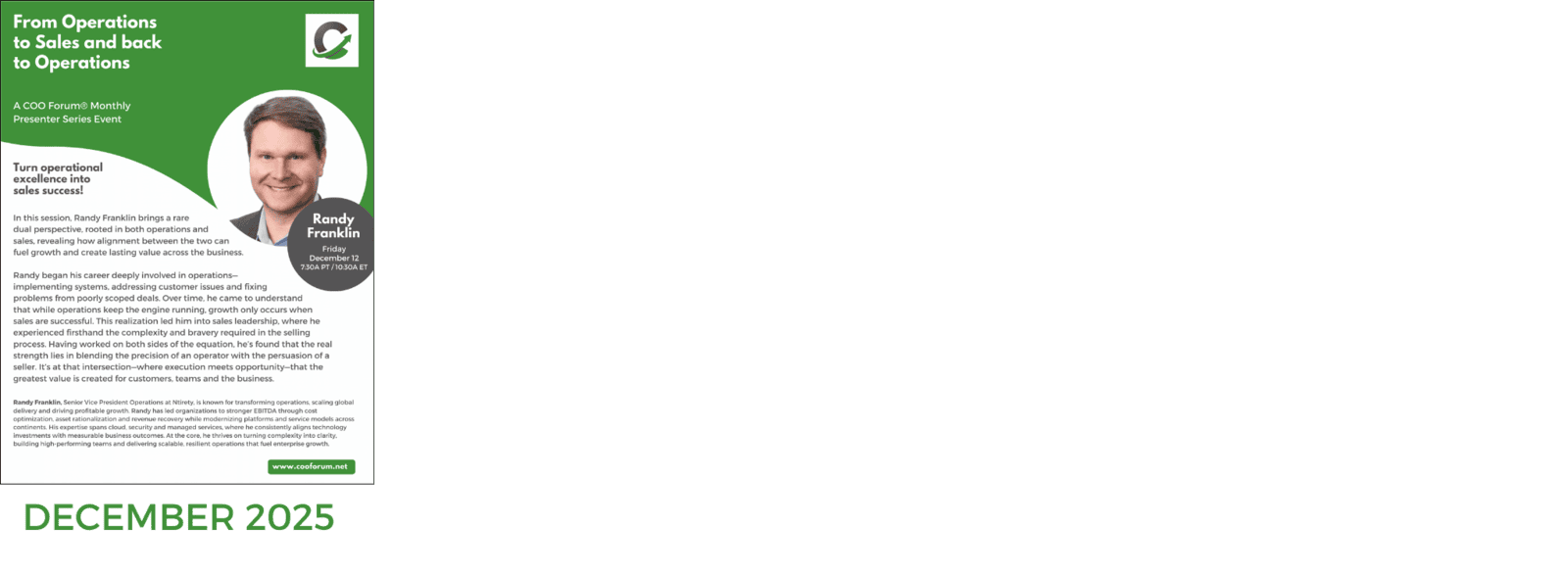 We bring our members and the best and brightest thought leaders together monthly for our Presenter Session. These 60-90 minute virtual sessions provide our members access to the latest thinking and tools around topics most important to operations executives.